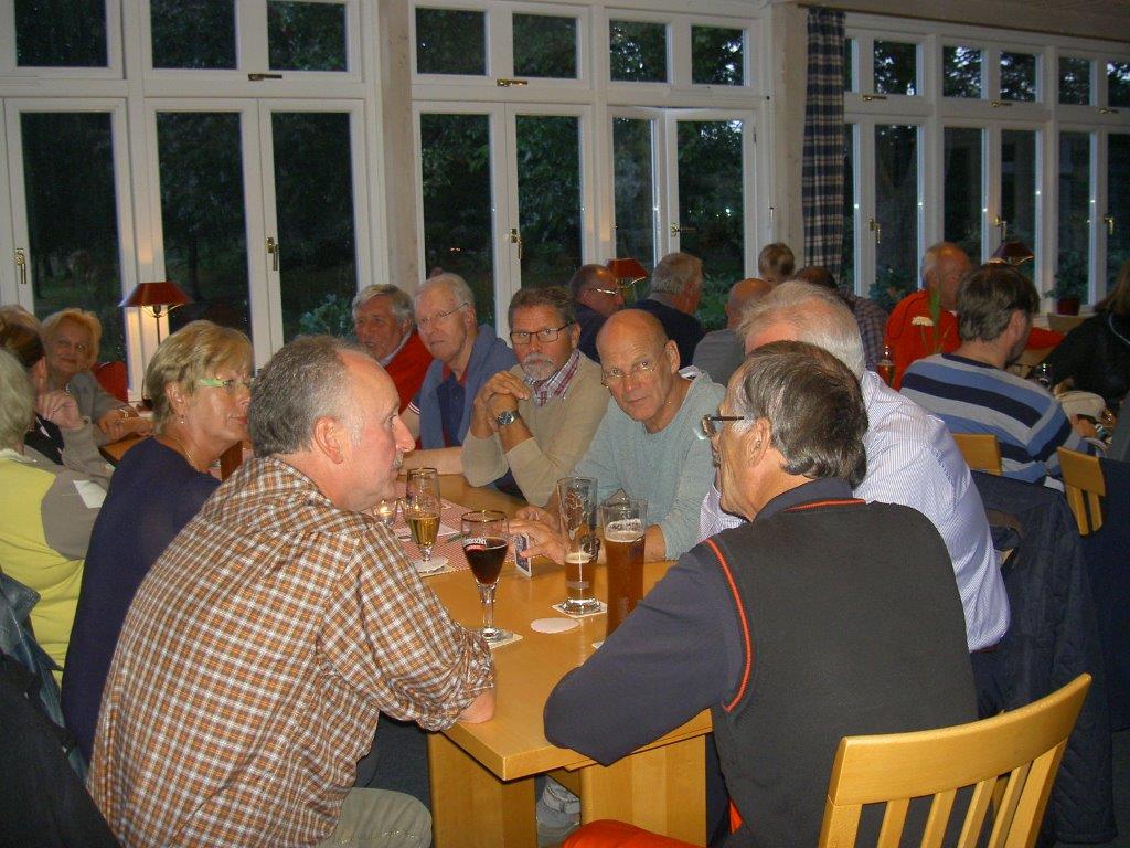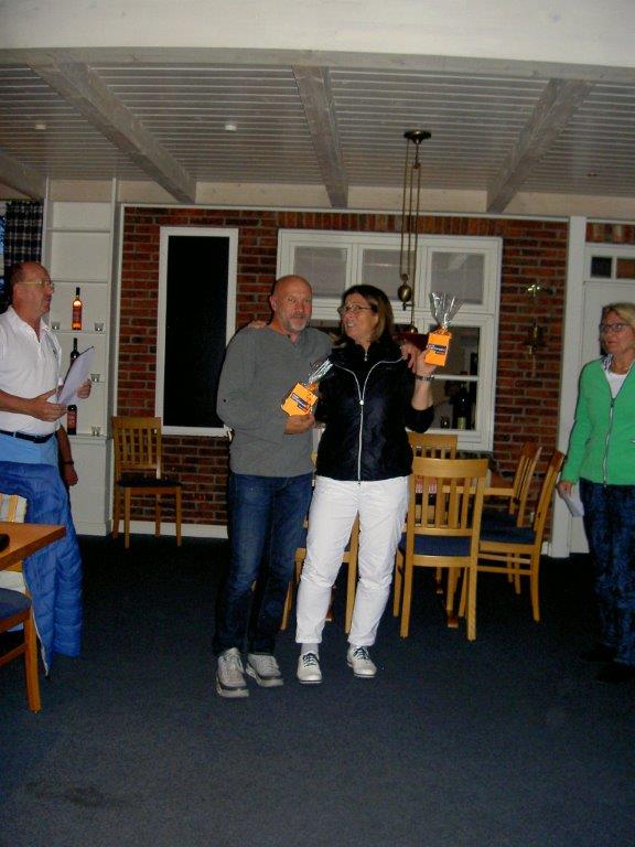 Für Scramble gibt es verschiedene Übersetzungen, z.B. klettern, drängeln, krabbeln, umherkriechen. Zum Klettern gab es nur eine Möglichkeit – ein höherer Knickwall. Aber genau dorthin schlug Klaus seinen Ball. Gedrängelt wurde garnicht – die nachkommenden Flights waren weit und breit nicht zu sehen. Krabbeln und umherkriechen trifft für uns am besten zu. Das haben wir ausgiebig praktiziert, um unsere Ballverluste in Grenzen zu halten – ja sogar, um uns an vielen gefundenen Bällen zu bereichern (Manni). Genug Zeit hatten wir ja, denn auf das leckere Buffet mussten wir ungeduldig bis 19.00 Uhr warten.